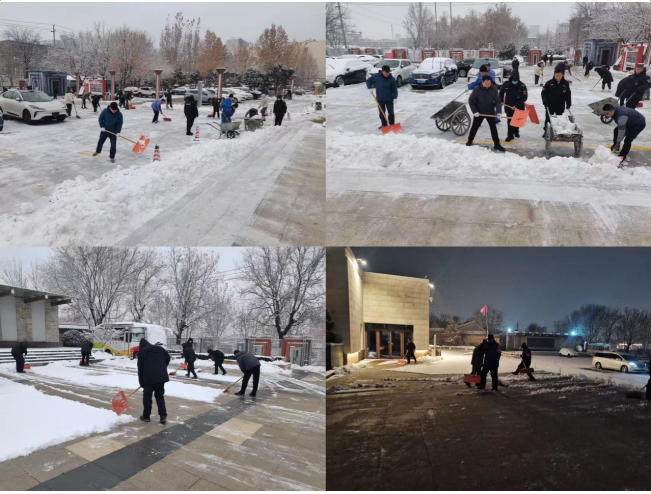 為保障文化館進(jìn)館參觀游客和市民的出行安全、游玩體驗,連心物業(yè)文化館項目部提前研判,備足掃雪工具、融雪劑等物資。“以雪為令,聞雪而動”,及時啟動雨雪天氣應(yīng)急預(yù)案,加強(qiáng)巡查,對易滑易結(jié)冰路段做到雨雪不停留清掃不間斷,夜間加班清掃,清早組織員工再次進(jìn)行除雪破冰。此舉更是得到了省文化館領(lǐng)導(dǎo)的大力支持,領(lǐng)導(dǎo)不僅躬身入局,還帶領(lǐng)著其他人員一起參與其中。大家不懼嚴(yán)寒,頂著凜冽的寒風(fēng),手持鐵鍬和掃帚積極投入到熱火朝天的掃雪活動中,對游客進(jìn)館參觀必經(jīng)的群星廣場、樓梯、四樓平臺等地方的積雪進(jìn)行清掃。盡管鵝毛般的大雪飄個不停,但是大家齊心協(xié)力、默契配合,鏟雪、鏟冰、裝車、清運、清掃一氣呵成,忙碌——成為風(fēng)雪中最靚麗的風(fēng)景線。你一鐵鍬我一掃帚,全力以赴、甩開膀子加油干,為前來參觀的游客掃出一條“平安路”。寒冷的天氣并沒有影響大家保障游客參觀安全的決心,但更加堅定了文化館項目部對“1+1=1”的服務(wù)理念的堅守。
