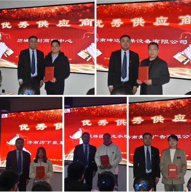 會(huì)議進(jìn)入頒獎(jiǎng)環(huán)節(jié),歷城世刻商貿(mào)中心、濟(jì)南坤達(dá)環(huán)保設(shè)備有限公司、濟(jì)南歷下泉東管道清理隊(duì)、天橋區(qū)得龍水暖器材經(jīng)銷部、濟(jì)南青龍廣告有限公司等5家供應(yīng)商榮獲濟(jì)南連心物業(yè)有限公司“2023年度優(yōu)秀供應(yīng)商”,并頒發(fā)“優(yōu)秀供應(yīng)商服務(wù)單位”榮譽(yù)證書。