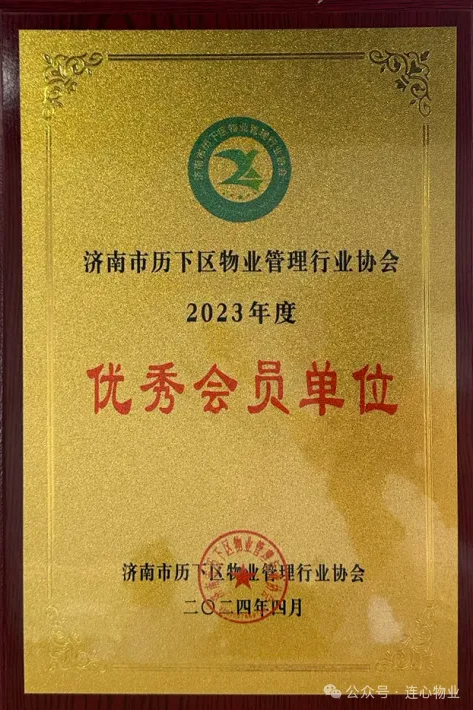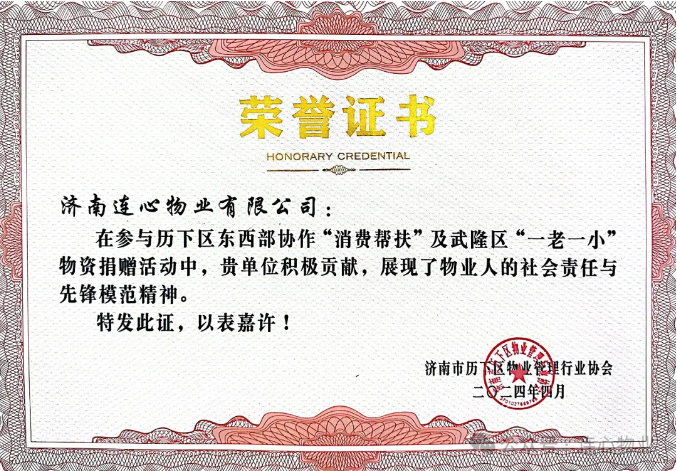 濟(jì)南連心物業(yè)有限公司榮獲歷下區(qū)物業(yè)管理行業(yè)協(xié)會“優(yōu)秀會員單位”“歷下區(qū)東西部協(xié)作會員單位”等榮譽(yù)稱號。
