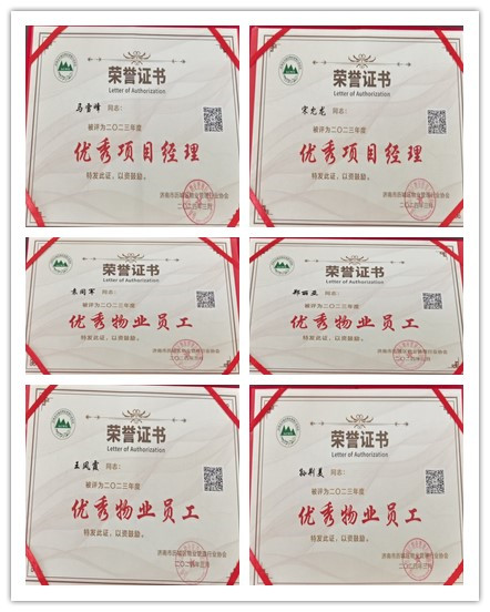 濟南連心物業(yè)有限公司榮獲“2023年度優(yōu)秀會長單位”、馬雪峰、宋允龍獲“2023年度優(yōu)秀項目經(jīng)理”馬曉婷、鄭麗亞、袁同軍、孫荊美、王風霞獲“2023年度優(yōu)秀員工”等榮譽稱號。