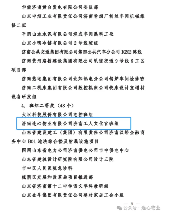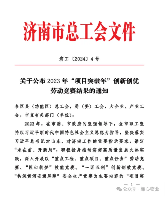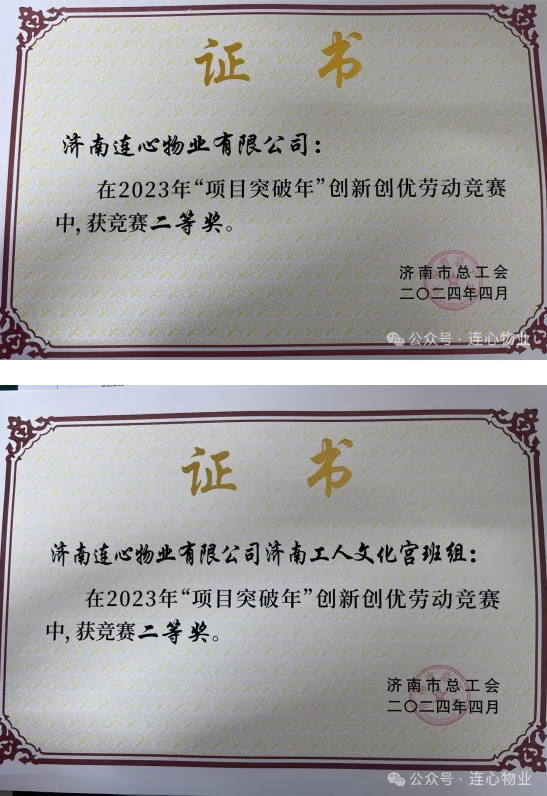 近日,濟南市總工會發(fā)布了關(guān)于公布2023年“項目突破年”創(chuàng)新創(chuàng)優(yōu)勞動競賽結(jié)果的通知,公布了2023年 “項目突破年”創(chuàng)新創(chuàng)優(yōu)勞動競賽獲獎的集體和個人名單,濟南連心物業(yè)有限公司和公司駐濟南工人文化宮班組均榮獲2023年“項目突破年”創(chuàng)新創(chuàng)優(yōu)勞動競賽二等獎。