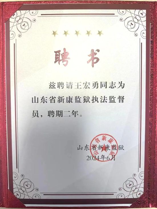 王宏勇同志被聘為“山東新康監(jiān)獄執(zhí)法監(jiān)督員”
