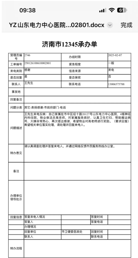 2025年1月27日,濟(jì)南連心物業(yè)有限公司駐山東電力中心醫(yī)院項(xiàng)目收到12345表?yè)P(yáng)電話,市民王先生通過(guò)撥打12345市民熱線,對(duì)公司駐山東電力中心醫(yī)院項(xiàng)目保潔員高桂萍表達(dá)誠(chéng)摯的感謝。