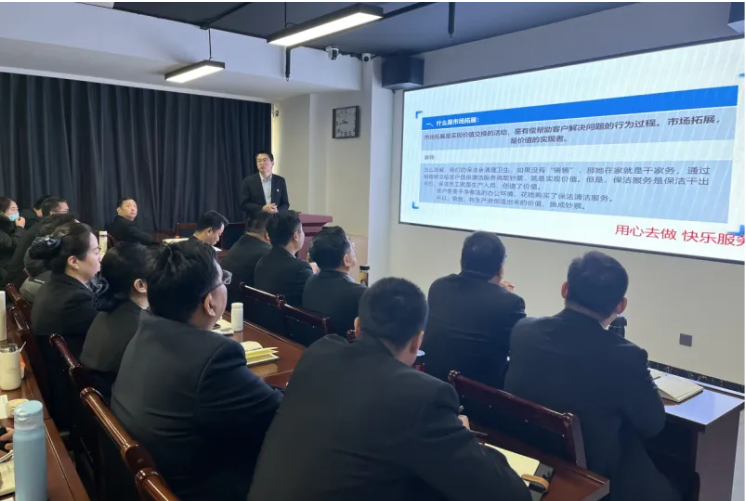 連心物業(yè)工會(huì)主席李寶建以“篤行致遠(yuǎn),破局而立”為題展開講解。他指出,要通過市場下沉策略,深入挖掘潛在客戶、打破行業(yè)壁壘,拓展業(yè)務(wù)邊界,利用存量項(xiàng)目打造區(qū)域名片,提升品牌影響力,同時(shí)成立市場團(tuán)隊(duì),集中資源進(jìn)行配合。他還強(qiáng)調(diào),要學(xué)習(xí)高效溝通技巧,提升情商,抓住主動(dòng)權(quán),主導(dǎo)談判,并運(yùn)用語言藝術(shù)吸引對(duì)方,以實(shí)現(xiàn)推銷公司和自我的目標(biāo)。