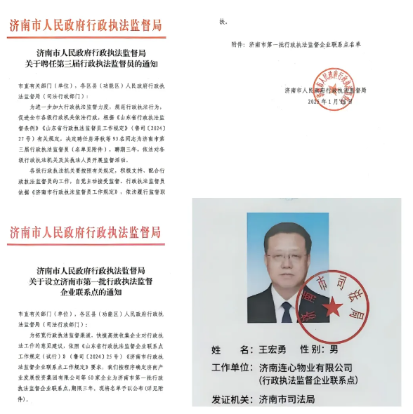 2025年1月15日,濟(jì)南市人民政府行政執(zhí)法監(jiān)督局印發(fā)《濟(jì)南市人民政府行政執(zhí)法監(jiān)督局關(guān)于設(shè)立濟(jì)南市第一批行政執(zhí)法監(jiān)督企 業(yè)聯(lián)系點(diǎn)的通知》、《濟(jì)南市人民政府行政執(zhí)法監(jiān)督局關(guān)于聘任第三屆行政執(zhí)法監(jiān)督員的通知》,濟(jì)南連心物業(yè)有限公司被確定為“第一批行政執(zhí)法監(jiān)督企業(yè)聯(lián)系點(diǎn)”之一,濟(jì)南連心物業(yè)有限公司黨支部書(shū)記、董事長(zhǎng)王宏勇被聘任為“第三屆行政執(zhí)法監(jiān)督員”。