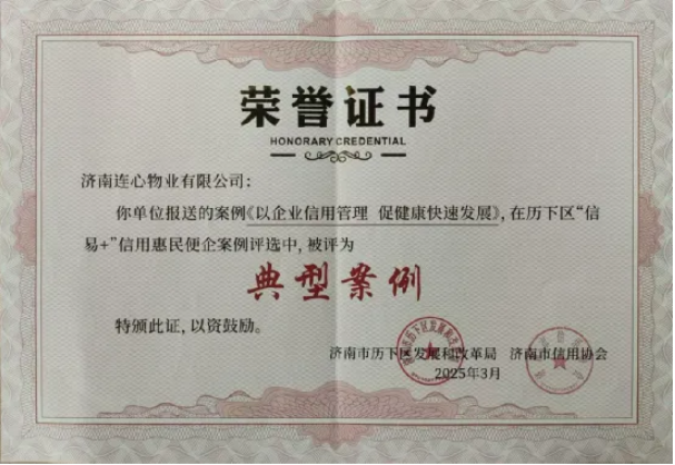 2025年3月13日上午9:30,“歷山英才·信耀講堂”暨歷下區(qū)企業(yè)誠(chéng)信聯(lián)盟總結(jié)大會(huì)在中國(guó)濟(jì)南人力資源服務(wù)產(chǎn)業(yè)園三樓313會(huì)議室舉行。濟(jì)南連心物業(yè)有限公司被評(píng)為“歷下區(qū)“信易+”信用惠民便企典型案例”單位。