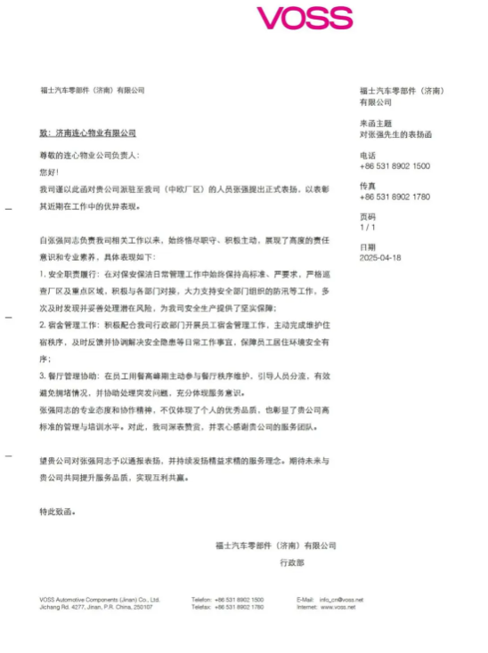 2025年4月18日,濟(jì)南連心物業(yè)有限公司收到來自福士汽車零部件(濟(jì)南)有限公司的表揚(yáng)函,對(duì)濟(jì)南連心物業(yè)有限公司駐福士汽車零部件(濟(jì)南)有限公司中歐廠區(qū)項(xiàng)目部員工張強(qiáng)同志在工作中優(yōu)異表現(xiàn)給予高度贊揚(yáng)。此次表揚(yáng)不僅是對(duì)員工個(gè)人的肯定,更是對(duì)連心物業(yè)服務(wù)品質(zhì)的充分認(rèn)可。