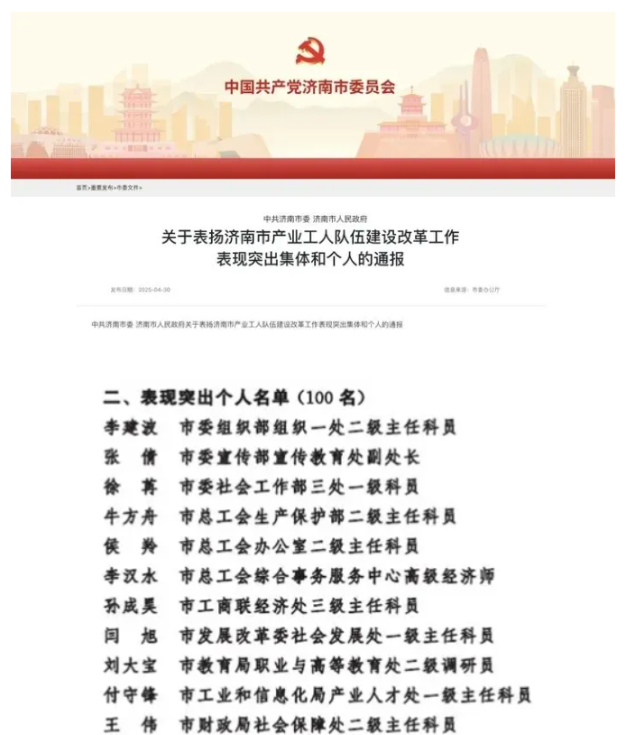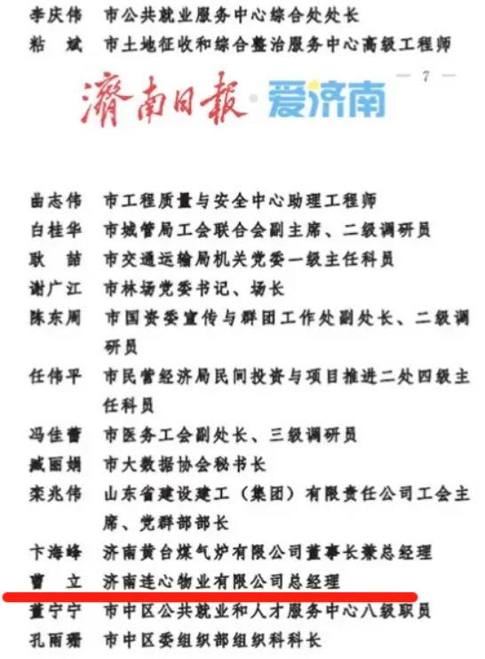 4月30日,中共濟南市委 濟南市人民政府發(fā)布《關(guān)于表揚濟南市產(chǎn)業(yè)工人隊伍建設(shè)改革工作表現(xiàn)突出集體和個人的通報》。濟南連心物業(yè)有限公司黨支部副書記、總經(jīng)理曹立榮獲產(chǎn)業(yè)工人隊伍建設(shè)改革工作“表現(xiàn)突出個人”榮譽稱號。