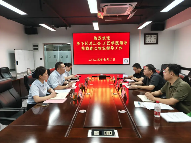 2025 年7月2日,歷下區(qū)總工會副主席、工匠學(xué)院院長趙戰(zhàn),副院長兼執(zhí)行院長李偉,辦公室主任劉旭一行蒞臨濟(jì)南連心物業(yè)指導(dǎo)工作。連心物業(yè)工會主席李寶建、工會副主席孫耀先、人資經(jīng)理李玉霞參加此次接待活動。