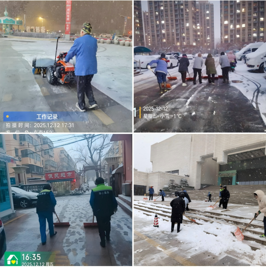 風(fēng)雪中,連心人身影堅定。員工們不畏嚴(yán)寒,手持雪鏟、掃帚等工具,分工明確、配合有序。大家優(yōu)先對主出入口、主干道等關(guān)鍵區(qū)域進(jìn)行集中清理,快速打通通行要道;隨后將清掃范圍擴(kuò)展至廣場、步道、停車場等公共區(qū)域,全面防止積雪結(jié)冰;通過全體人員的高效協(xié)作,各園區(qū)主要通道迅速恢復(fù)暢通,最大程度降低了降雪對業(yè)主生活和工作的影響。