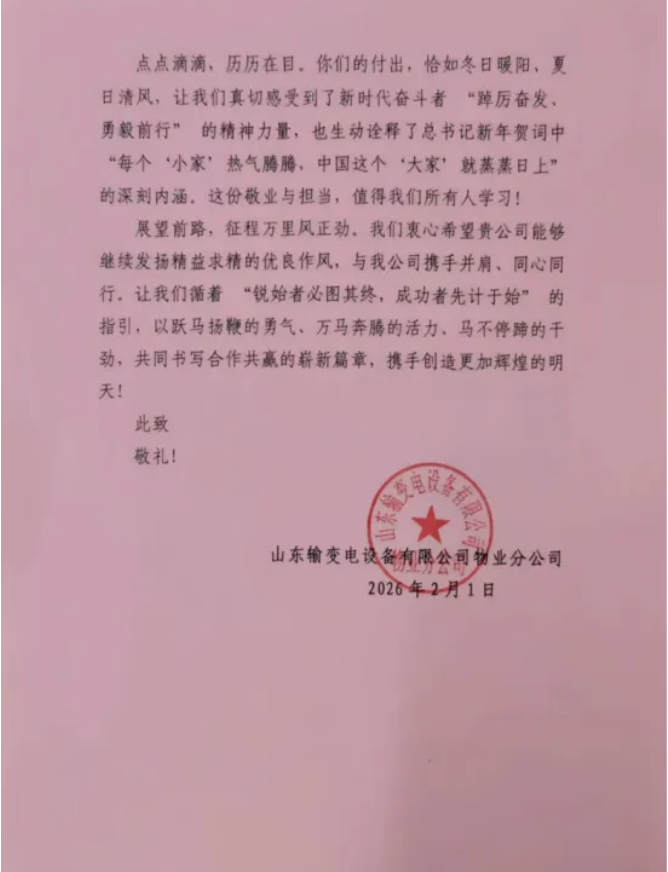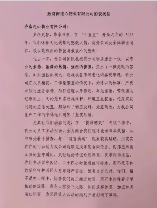 2026年2月1日,濟南連心物業(yè)有限公司收到一封來自山東輸變電設(shè)備有限公司表揚信,對連心物業(yè)過去一年的工作、服務(wù)品質(zhì)、團隊素養(yǎng)與擔(dān)當(dāng)精神給予高度評價與認(rèn)可。
