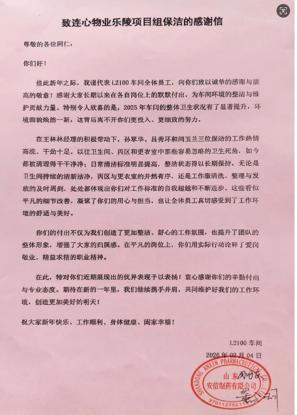 2026年2月4日,濟(jì)南連心物業(yè)有限公司收到一封來自山東安信制藥有限公司的一封感謝信,對連心物業(yè)項目保潔團(tuán)隊一年的辛勤付出致以誠摯謝意,并對2025年車間環(huán)境衛(wèi)生的顯著提升給予高度評價。
