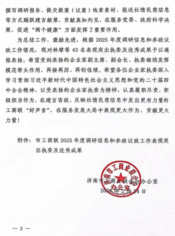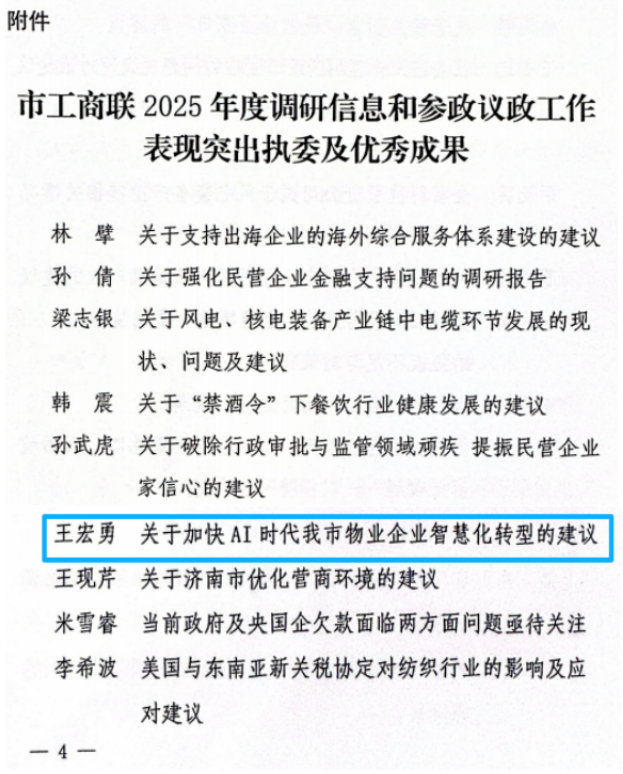 2024年2月24日,濟(jì)南市工商聯(lián)頒布“2025年度調(diào)研信息和參政議政工作表現(xiàn)突出執(zhí)委及優(yōu)秀成果”,濟(jì)南連心物業(yè)有限公司董事長王宏勇等43名執(zhí)委獲評表現(xiàn)突出執(zhí)委,他撰寫的《關(guān)于加快AI時代我市物業(yè)企業(yè)智慧化轉(zhuǎn)型的建議》獲評優(yōu)秀成果。
