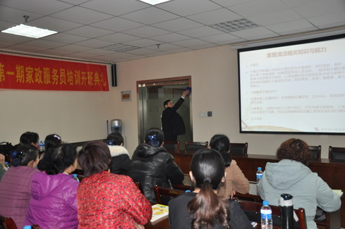 2015年3月24日上午9:00,濟南連心職業(yè)培訓學校啟動儀式暨第一期家政服務員培訓開班典禮在連心培訓教室銀座晶都1-2307舉行。濟南市職業(yè)技能鑒定中心主任陳洪亮、濟南市商務局商貿(mào)服務管理處副處長張建宏、濟南市職業(yè)技能鑒定中心部長宋平、濟南連心職業(yè)培訓學校校長王宏勇、濟南連心物業(yè)有限公司常務副總經(jīng)理戚圣輝、濟南連心物業(yè)有限公司副總經(jīng)理孟令乾、濟南連心職業(yè)培訓學校主講教師吳建軍、曹立及第一期家政服務員33人參加了此次活動。