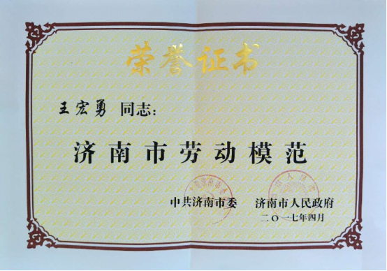 --王宏勇同志榮獲“濟(jì)南市勞動模范”榮譽(yù)稱號