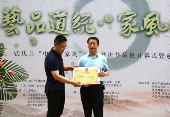 2017年6月10日10:30點(diǎn),“藝品道統(tǒng)·家風(fēng)傳承”張慶三“中華好家風(fēng)”主題書法作品展開幕式暨慈善捐贈(zèng)儀式,在濟(jì)南連心物業(yè)有限公司提供物業(yè)服務(wù)的星工坊園區(qū)的中國工業(yè)藝術(shù)館隆重舉行。山東大學(xué)書畫研究院院長、著名書法家王培元,濟(jì)南市委宣傳部原常務(wù)副部長、中華文化促進(jìn)會會長凌安中、中國致公黨山東省委一支部主委于溪,山東星工坊影視文化有限公司總經(jīng)理、中國工業(yè)藝術(shù)館館長趙京橋等領(lǐng)導(dǎo)出席了開幕式。