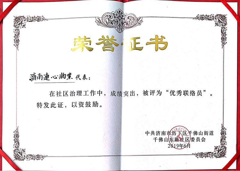 濟(jì)南連心物業(yè)有限公司作為物業(yè)工作人員在社區(qū)治理工作中,成績(jī)尤為突出,公司駐山東省文化館項(xiàng)目部項(xiàng)目經(jīng)理李寶建作為物業(yè)人員代表被授予“優(yōu)秀聯(lián)絡(luò)員”榮譽(yù),這是對(duì)連心物業(yè)工作的高度認(rèn)可。