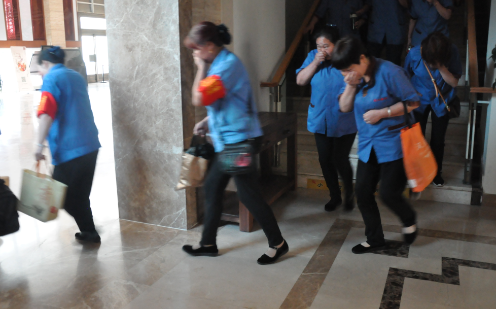 14:43分伴隨著總指揮的一聲令下,消防演習(xí)正式拉開了帷幕。位于四樓走廊垃圾桶內(nèi)煙頭未滅突然起大火,情況危急,消控人員發(fā)現(xiàn)火情立即報告總指揮啟動滅火疏散應(yīng)急預(yù)案,同時啟動消防廣播播報消防疏散通知。在總指揮的指揮下,滅火行動組、疏散警戒組、通訊聯(lián)絡(luò)組同時展開行動:滅火行動組迅速趕赴火災(zāi)現(xiàn)場拿取就近的消防器材進(jìn)行滅火;疏散警戒組迅速引領(lǐng)各樓層人員從安全通道撤離到廣場處安全地帶;通信聯(lián)絡(luò)組則在疏散同時將現(xiàn)場情況及時反饋給總指揮。整個滅火疏散演練過程有序、緊湊、高效,所有人員有序撤離到廣場安全地點(diǎn)清點(diǎn)人數(shù),此項(xiàng)演練總用時2分07’。