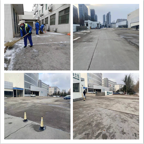 24日約凌晨5點(diǎn),地上開始由明顯積雪,秩序維護(hù)夜班人員開始對大門口和門口通往辦公樓、車間、車棚進(jìn)行除雪。7點(diǎn)整,山東博士倫福瑞達(dá)項(xiàng)目全體人員到崗,按照各自分工進(jìn)行除雪。秩序維護(hù)夜班主動晚下班一小時,配合白班對大門口及進(jìn)門后東西兩側(cè)除雪,樓層保潔對進(jìn)樓臺階進(jìn)行清理,并鋪好防滑墊,外圍分成2組,一組對廠區(qū)主干道警醒清理,一組開始撒鹽水化雪。