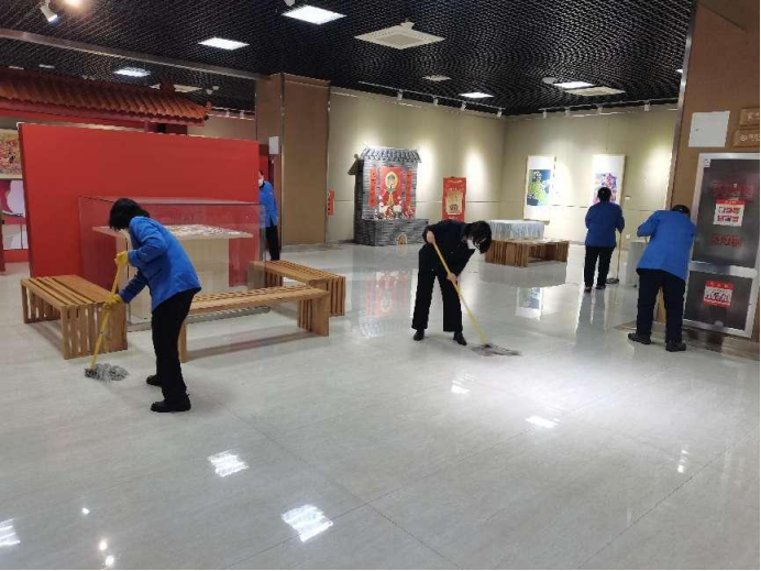 為了全力做好此次非遺月的物業(yè)服務保障工作,項目部成立服務保障小組。1月8日下午,項目部召集安保、保潔、會服、工程四條線負責人成立了保障協調小組,負責非遺展廳的后勤保障工作,秩序維護人員不僅要做好門崗安全和指揮運輸車輛,同時幫助裝卸貨物和作品。保潔組全體人員齊上陣,打掃大廳、展廳。7點半至9點半彩排,時間緊任務重,拖地、收拾垃圾,每個人都加緊干,涮洗拖把都一溜小跑,所有保潔人員只記得任務所在,忘記了勞累,每個人都忙的滿頭大汗。
