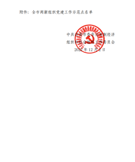 近日,中共濟南市委非公有制經(jīng)濟組織和社會組織工作委員會公布了“關(guān)于命名市級兩新組織黨建工作示范點的通知”,濟南連心物業(yè)有限公司被確定為“市級兩新組織黨建工作示范點”。