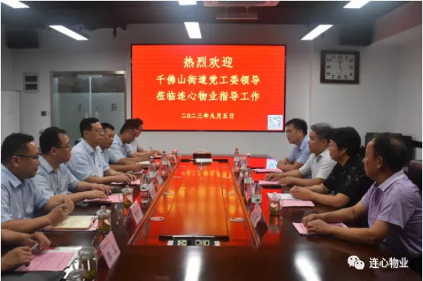 2023年9月5日下午,千佛山街道黨工委副書(shū)記、辦事處主任王軍凱、人大工作室主任朱曉紅、黨工委副書(shū)記陳祖軍、街道社會(huì)事務(wù)辦公室副主任趙孔希等蒞臨濟(jì)南連心物業(yè)有限公司進(jìn)行工作調(diào)研。濟(jì)南連心物業(yè)有限公司黨支部書(shū)記、董事長(zhǎng)王宏勇,副董事長(zhǎng)兼產(chǎn)發(fā)連心物業(yè)總經(jīng)理戚圣輝,黨支部副書(shū)記、總經(jīng)理孟令乾,副總經(jīng)理曹立,工會(huì)主席李寶建,總經(jīng)理助理李義,辦公室主任孫耀先等參加調(diào)研匯報(bào)工作。